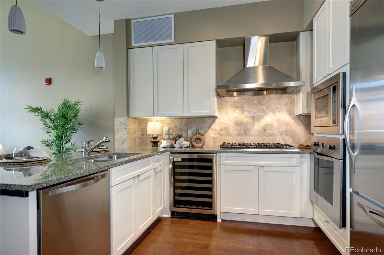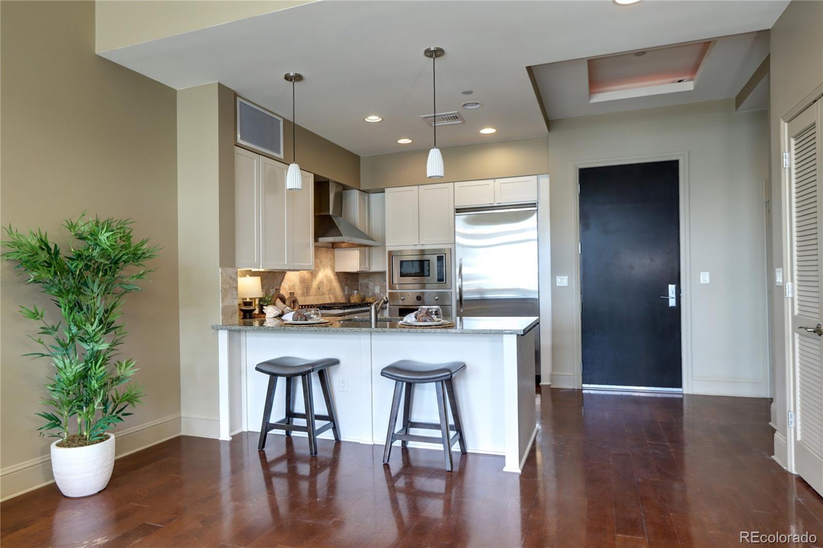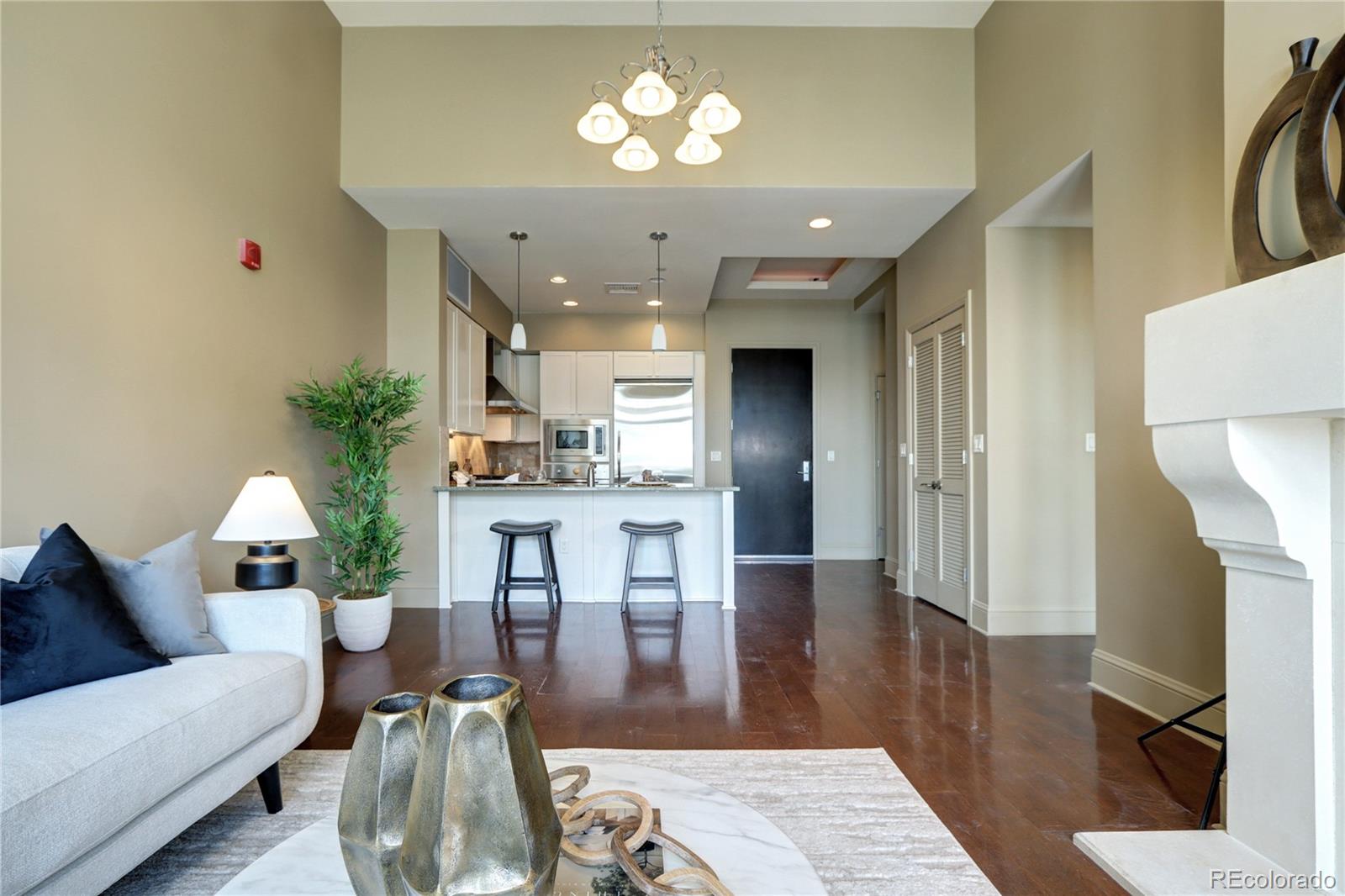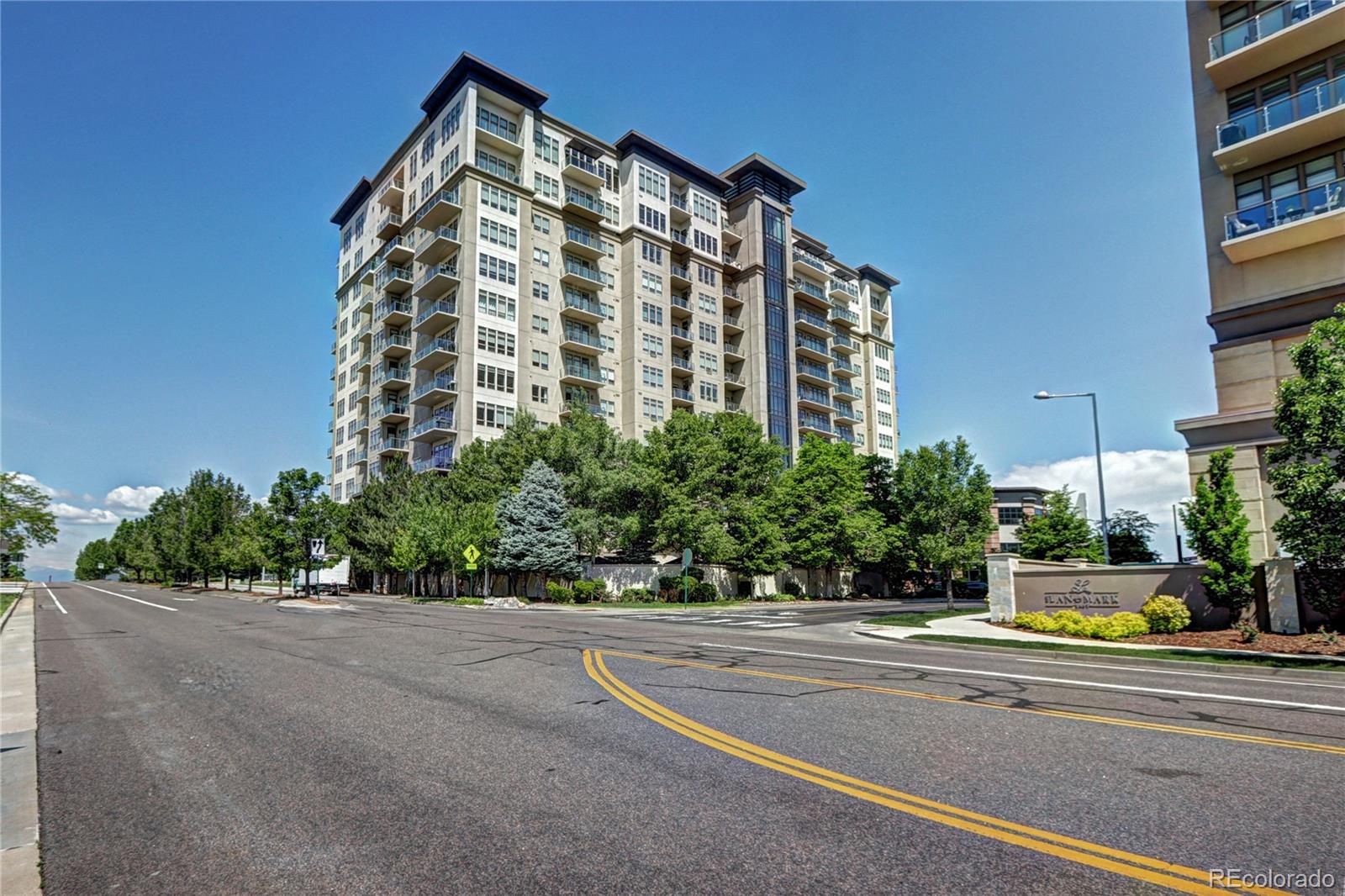 Incredible Penthouse Beautiful 1 bed, 1 bath condo in The Landmark, Greenwood Village's premier luxury community. Enjoy concierge service, top-tier amenities, and a low-maintenance lifestyle in an unbeatable location. The kitchen features Viking stainless appliances--including built-in fridge, oven, microwave, wine cooler, dishwasher, and 6-burner gas cooktop--paired with quartz counters and rich wood cabinetry. The open living area is light-filled with high ceilings, eastern views, and a gas fireplace. Step onto the spacious balcony to soak up the Colorado sunshine. The bedroom suite includes floor-to-ceiling windows, high ceilings, and a spa-like bath with dual sinks, travertine finishes, and a frameless glass shower. A walk-in closet and ample storage throughout offer space to live comfortably. A flexible nook near the entry is perfect for an office or extra storage, and the in-unit washer/dryer adds everyday ease. Enjoy two pools/spas, gym, wine cellar, theatre, library, secure parking, and more. Steps to Landmark Theatre, dining, shops, and minutes to DTC, downtown, and DIA. Luxury living made effortless.